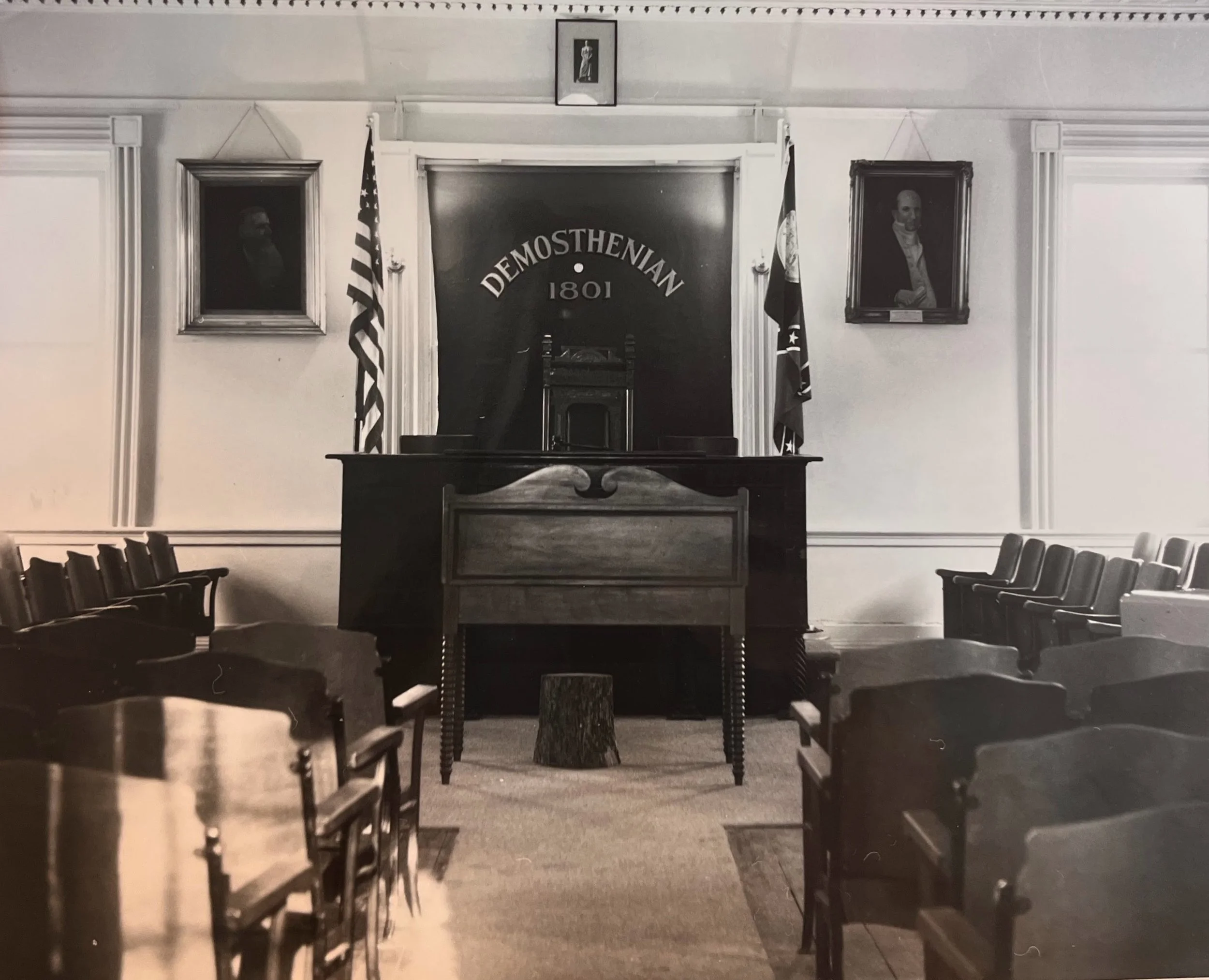 The speaker’s lectern of the society is an original piece from the 1820’s that was hand built for the society. Underneath the lectern is a stump from the Robert Toombs Oak, a tree under which Toombs gave reportedly his 1828 commencement speech. When he died in 1885, legend says the tree was struck by lightning. The stump is now used by the society for election speeches.